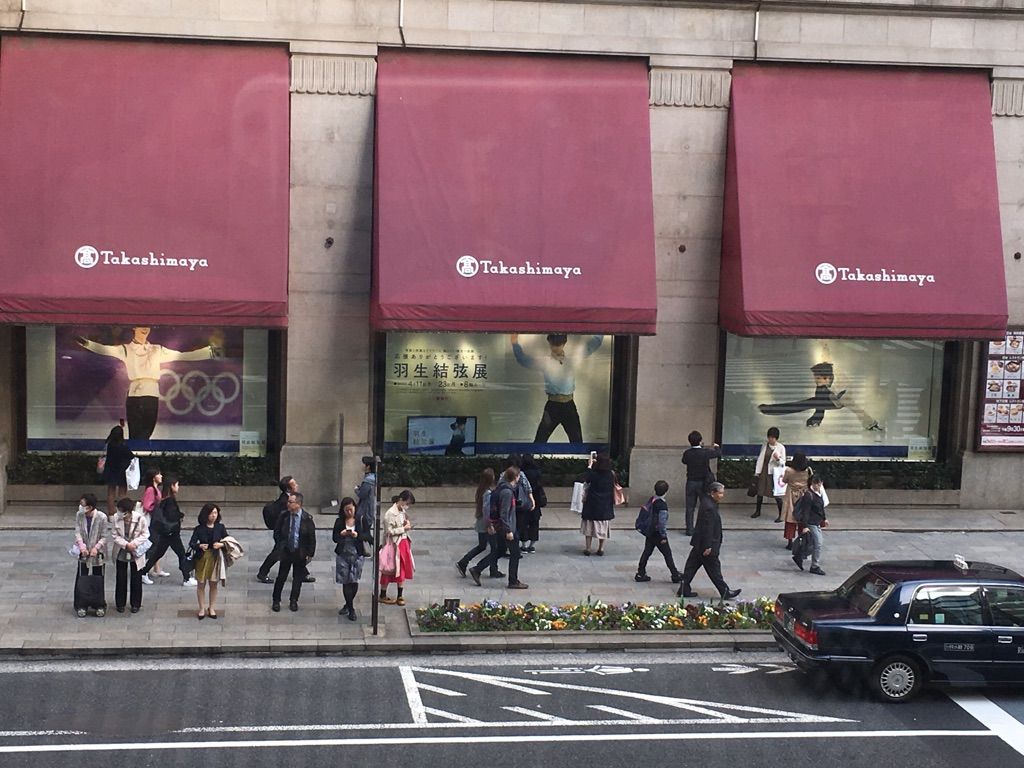 丸善から見た高島屋のショーウィンドーは全て羽生選手が占領していました。