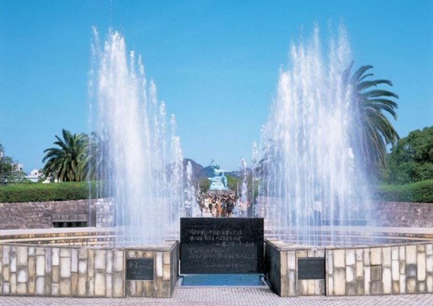平和の泉の噴水の向こうに平和祈念像。作者は北村西望。