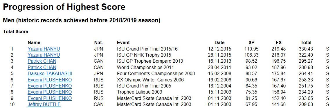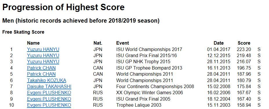 ISUのサイトから最高得点更新記録をご覧ください。ここには10位まで転載しました。