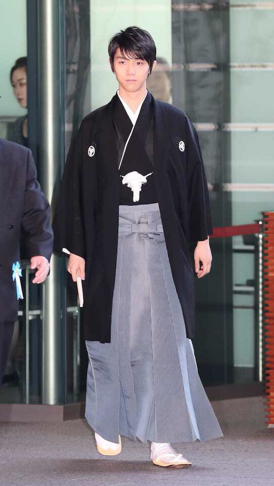 はかまは江戸時代から続く絹織物「精好(せいごう)仙台平」の技術保持者として、人間国宝に認定された仙台市の甲田綏郎(よしお)さんから贈られた。6月に羽生の国民栄誉賞受賞を知った甲田さんから、仙台市を通して申し出があった。「仙台を代表する人、そして震災復興にも尽力してくださっている。立派な装いで式に臨んでほしい」。帯と共に届いたはかまと、羽生家の家紋が入った羽織をあわせ、晴れ舞台に立った。