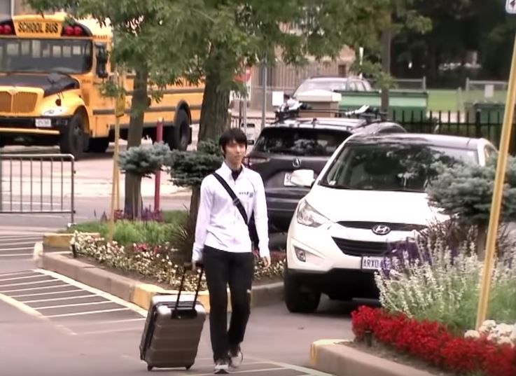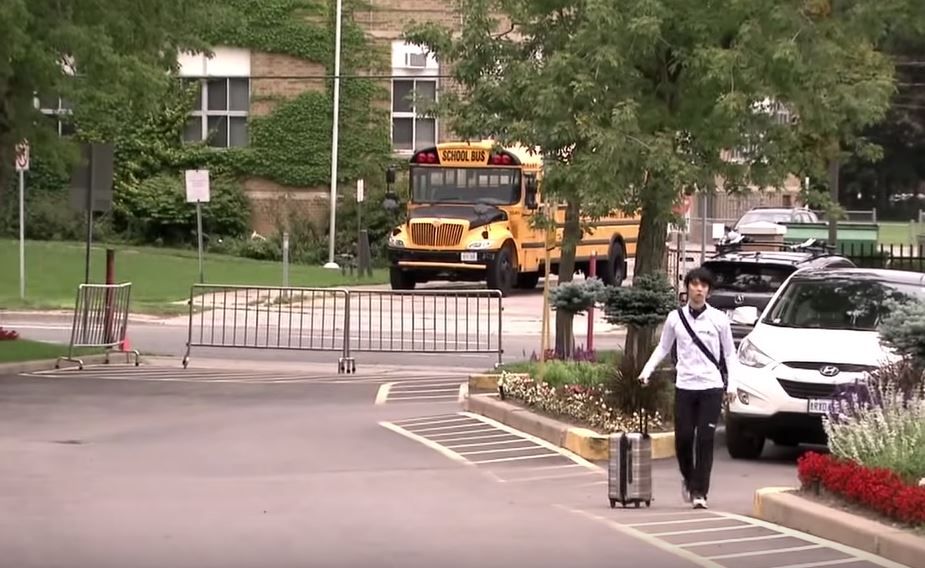 クリケットクラブ入り口に向かう羽生選手の後ろに見えるスクールバスのレトロなデザインが新鮮です。