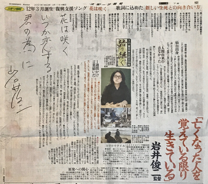岩井監督も仙台出身で、大震災の時はロサンゼルスにいて、東京のスタッフと電話の最中にあの大地震が発生したのだそうです。