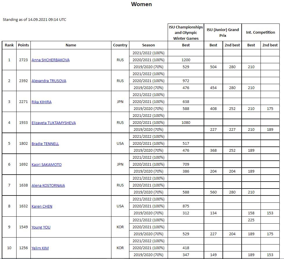 ISU世界ランキングの各ジャンルは以下のリンクからどうぞ。