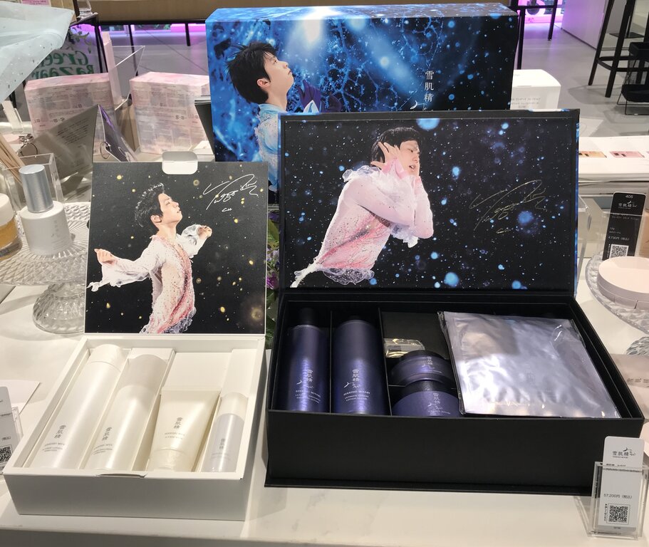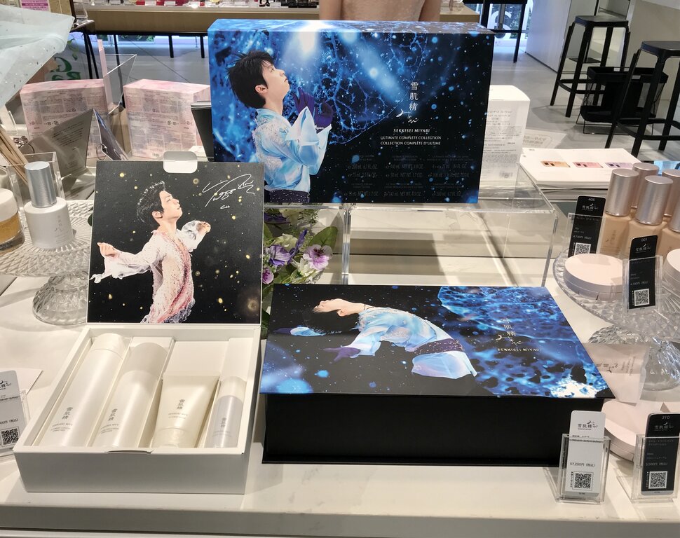 店内をさらに進むと、メイクレッスンのコーナーには、壁面いっぱいのおおきな画面に結弦くんの写真が映し出されていて、ここでも「みやびやかなひと刻・第三夜」のナレーションが流れていました。