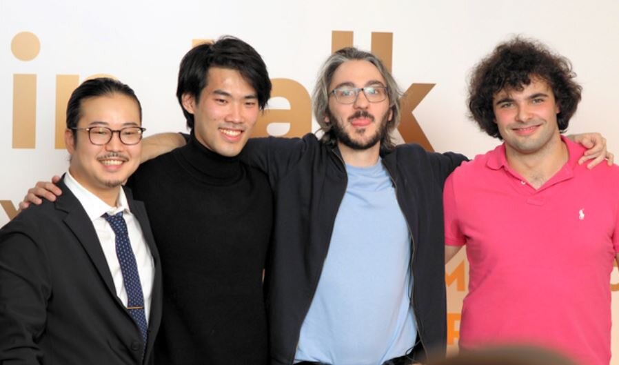 ショパン国際ピアノコンクールの上位入賞者。2位の反田恭平さん(左)、1位のブルース・リウさん(カナダ、左から2人目)、2位のアレクサンダー・ガジェブさん(イタリア・スロベニア、右から2人目)、3位のマルティン・ガルシア・ガルシアさん(スペイン)=2021年10月21日午前2時32分、ワルシャワ、野島淳撮影