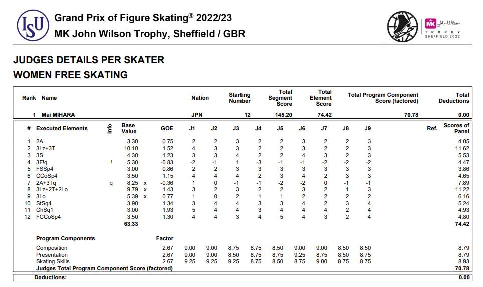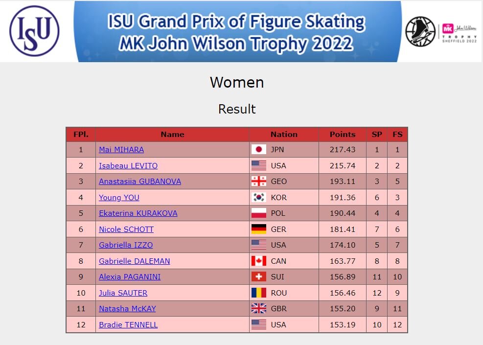 SP2位で、昨季世界ジュニア選手権覇者の15歳、イサボー・レビト(米国)が143・68点、合計215・74点で2位。SP3位のアナスタシヤ・グバノワ(ジョージア)が126・29点、合計193・11点で3位だった。