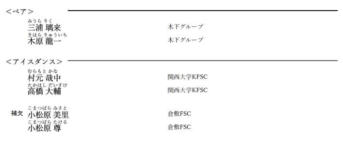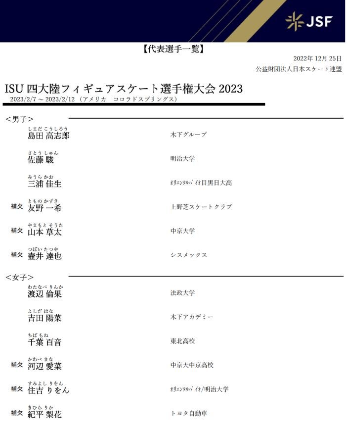 全日本選手権終了後に発表された、2023世界選手権、四大陸選手権、世界ジュニアへの派遣選手のリストです。
